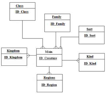 MAIN(ID_Creature, Rus_Name, Lat_Name, Date, ID_Kingdom, ID_Class, ID_Family, ID_Sort, ID_Kind,ID_Region, Population)