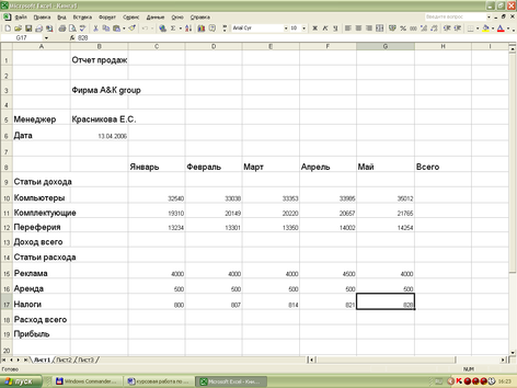 Статьи компьютеры, комплектующие, периферия, реклама, аренда, налоги заполните произвольными значениями. В ячейку Н8 введите Всего. После выполнения всех указанных действий ваша таблица должна иметь вид