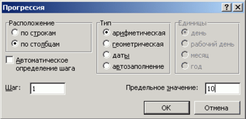 Тип прогрессии (арифметическая, геометрическая, даты, автозаполнения);