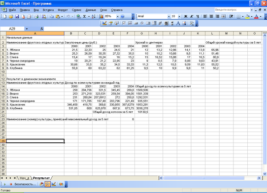 Cells(23, 1) = "Наименование (номер) культуры, принесший максимальный доход за 5 лет"