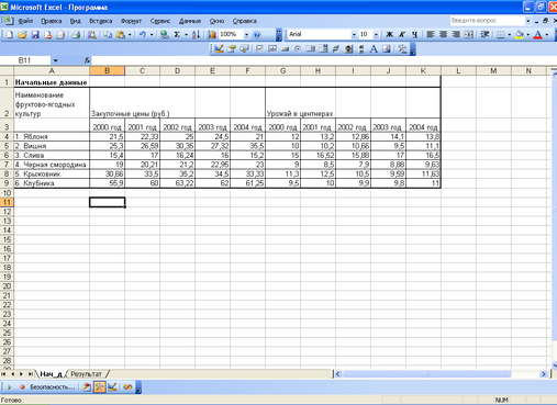 Исходные данные в виде таблицы, где указаны наименования фруктово-ягодных культур, закупочные цены каждой культуры и урожай в центнерах в каждом году;