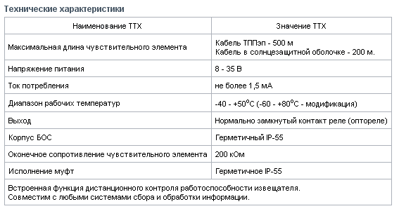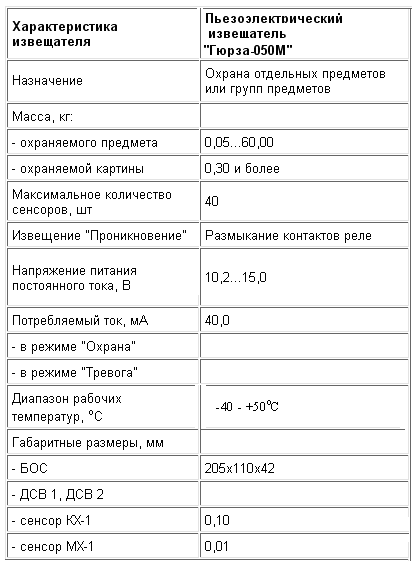 Таблица 2. Характеристики пьезоэлектрического извещателя "Гюрза 0-50М"