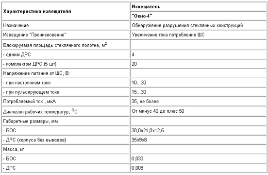 3. Для защиты окон, оконных решеток используем ударно-контактный извещатель "Окно-4". Он обладает следующими характеристиками: