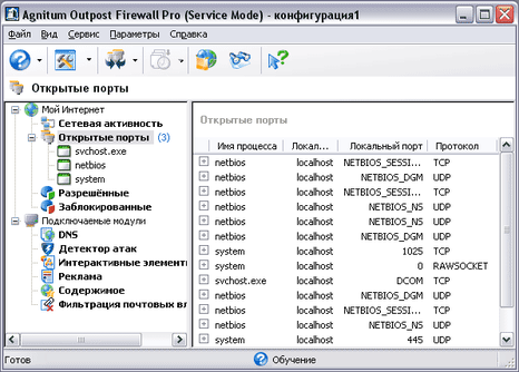 Рис.11 модуль "Открытые порты" фаервола Outpost