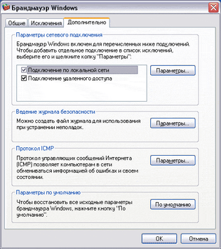 Параметры сетевого подключения - здесь перечислены все сетевые подключения, которые существуют на компьютере под защитой встроенного брандмауэра. Путем установки или снятия флажка напротив каждого из подключений можно включить или выключить брандмауэра для каждого из подключений. При помощи кнопки Параметры можно настроить параметры работы брандмауэра для каждого из подключений, если используется общий доступ к этому подключению.