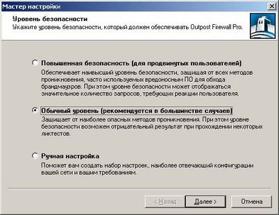 Рис.6. Выбор уровня безопасности фаервола Outpost