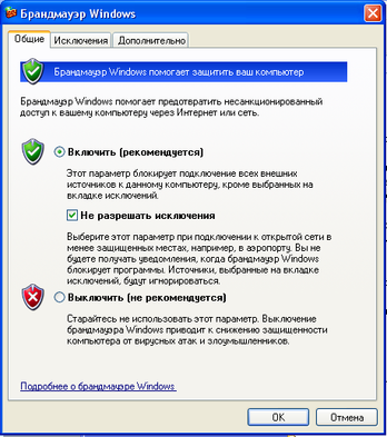 В этом окне можно включить или выключить брандмауэр для всех соединений с сетью. Пункт Не разрешать исключения активизирует режим работы брандмауэр, при котором брандмауэр не выводит на экран оповещений о блокировке и отключает список исключений, который можно задать на следующей вкладке окна управления брандмауэр.