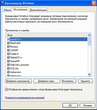 Брандмауэр Windows по умолчанию включен, некоторыми возможностями ряда программ можно будет воспользоваться только после включения программы в список на вкладке Исключения брандмауэра Windows.