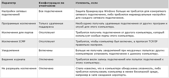 Таблица 4. параметры брандмауэра Windows по умолчанию
