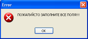 1. Если во время заполнения регистрации было не заполнено одно или более полей и была нажата кнопка "Продолжить", то программа выводит следующее сообщение (Рис.18.1).