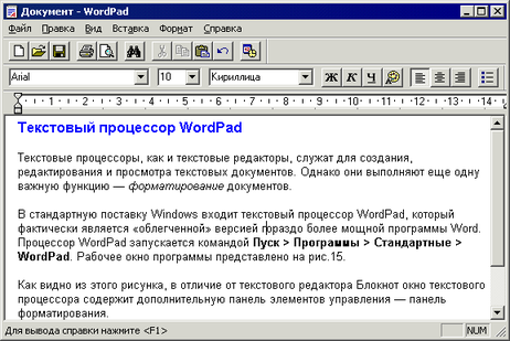 Поскольку с приемами создания и редактирования документа мы знакомы по текстовому редактору Блокнот, то на примере текстового процессора WordPad мы ознакомимся с простейшими приемами форматирования документов.