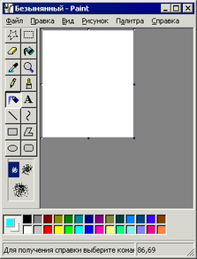 В состав элементов управления рабочего окно программы Paint, кроме строки меню, входят панель инструментов, палитра настройки инструмента и цветовая палитра (см. Рисунок1). Кнопки панели инструментов служат для вызова чертежно-графических инструментов. На палитре настройки можно выбрать параметры инструмента (толщину линии, форму оттиска, метод заполнения фигуры и т.п.). Элементы цветовой палитры служат для выбора основного цвета изображения (щелчком левой кнопки) и фонового цвета (щелчком правой кнопки).