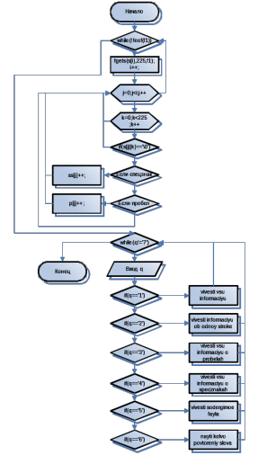 cout<<"kolvo probelov v "< cout<<"kolvo specznakov v "< } cout<<"kolvo slov v fayle="< getche(); } if(q=='2') { cout<<"vvedite nomer stroki"; cin>>j; cout<<"kolvo probelov v "< cout<<"kolvo specznakov v "< getche(); } if(q=='3') { for(j=0;j cout<<"kolvo probelov v "< getche(); } if(q=='4') { for(j=0;j cout<<"kolvo specznakov v "< getche(); } if(q=='5') { for(j=0;j cout< getche(); } if(q=='6') { int len,qw=0,ks=0; char slovo[20]; cout<<"vvedite iskomoe slovo "; cin>>slovo; len=strlen(slovo); for(int i1=0;i1 for(int i2=0;i2<55;i2++) { if(s[i1][i2]==slovo[qw]) qw++; else qw=0; if((qw+1)==len) ks++; } cout< "< getche(); } } }