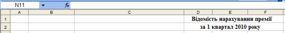 Наприклад, для введення заголовка таблиці в роботі виділили клітини D1: I1, об’єднали і ввели текст “Відомість нарахування премії ”.