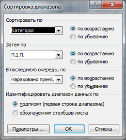 В діалоговому вікні “Сортування" встановити відповідні ключі та параметри: