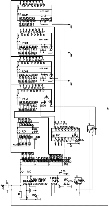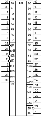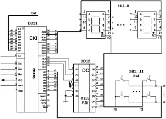 Внутрішня адресація виробляється по входу A0, тому на цей вхід потрібно подати сигнал з адресної шини. Обмін даними йде по шині даних. Входи RL0-RL7 мікросхеми служать для зчитування стану клавіш клавіатури; виходи OutA3-OutA0, OutB0-OutB3 підключаються до індикаторів; виходи S0-S3 - це виходи сканування рядків клавіатури й перебору індикаторів при відображенні. При надходженні інформації від клавіатури контролер виробляє запит на переривання, виставляючи на виході IRQ сигнал активного рівня. Цей сигнал надходить на один із входів зовнішніх переривань мікроконтролера.