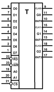 Вхідні сигнали CLK0 - CLK2 подаються через схеми із зовнішніми керуючими входами GATE0 - GATE2. Кожен лічильник має вихідний сигнал OUT. Інші вузли схеми призначені для установки режиму й реалізації інтерфейсу із системною шиною.