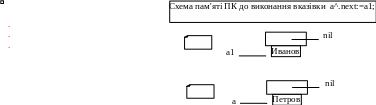Елемент списку a1^– це динамічна змінна (наприклад типу zapis=record), яка в найпростішому випадку складається з двох полів: інформаційного (наприклад, name:string) та змінної-вказівника на наступний елемент списку (next:^zapis). Тобто, динамічна змінна – елемент списку – крім деякого значення містить адресу (змінну-вказівник) наступного елемента списку.