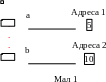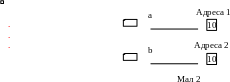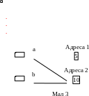 Якщо ж замість a^:=b^ записати a:=b, то напрям вказівника a змінюється. Змінна-вказівник a буде вказувати на ту ж змінну, що і вказівник b.(мал 3). Тепер значення динамічної змінної, що знаходиться за адресою 2 можна змінити двома способами: використовуючи вказівник a та вказівник b.