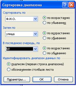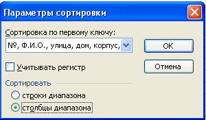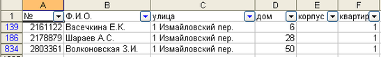 Выбрать в раскрывающемся списке Сортировка по первому ключу: пользовательский порядок сортировки: №, Ф.И.О., Улица, Дом, Корпус, Кв..