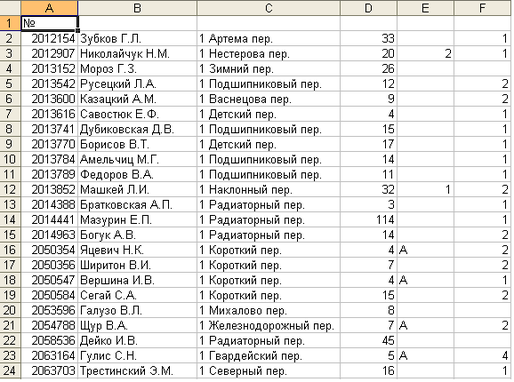 Отсортируем базу данных в алфавитном порядке по столбцу Ф. О. И. , а затем по столбцу Улица и по столбцу №.