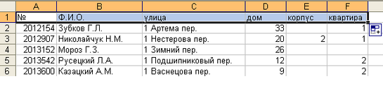 Создадим пользовательский список: №, Ф.И.О., Улица, Дом, Кв., Корпус. Введем этот список в первую строку рабочего листа, используя автозаполнение.