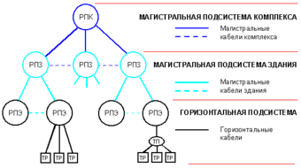 Примечание: РПК - распределительный пункт комплекса, РПЗ - распределительный пункт здания, РПЭ - распределительный пункт этажа, ТП - точка перехода, ТР - телекоммуникационный разъем.