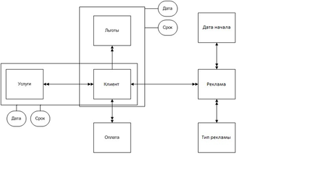 Задание: предметная область "Реклама в коммерческом издании". Возможные виды деятельности: учет клиентов с возможными льготами; учет совершенных ими заказов по различным направлениям; расчет стоимости заказа с учетом типа, даты продолжительности; оплата клиентами услуг.