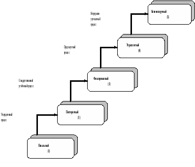 Пять уровней зрелости СММ представлены на рис.2. Стрелки на рисунке указывают вид возможностей процесса, который официально утверждается организацией на каждом уровне зрелости. Названия уровней отражают сущность изменений в основном процессе программирования: