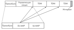 Данные на физическом уровне передаются в виде непрерывной последовательности кадров. Каждый кадр имеет фиксированную длительность – 0,5; 1 и 2 мс, поэтому его информационная емкость зависит от символьной скорости и метода модуляции. Кадр состоит из преамбулы (синхропоследовательности длиной 32 QPSK-символа), управляющей секции и последовательности пакетов с данными (см рис. 3.3.). Поскольку определяемая стандартом IEEE 802.16 система двунаправленная, необходим дуплексный механизм. Он предусматривает как частотное (FDD5), так и временное (TDD6) разделение восходящего и нисходящего каналов.