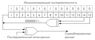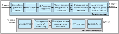 Тракт обработки данных и формирования выходного сигнала для передачи через радиоканал в стандарте IEEE 802.16 достаточно обычен для современных телекоммуникационных протоколов (см. рис. 3) и практически одинаков для восходящих и нисходящих соединений. Входной поток данных скремблируется – подвергается рандомизации2, то есть на него накладывается (XOR) псевдослучайная последовательность (ПСП), вырабатываемая с помощью линейного регистра сдвига длины 15 с характеристическим многочленом
