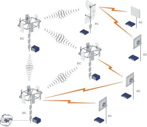 РС (рисунок 2.16 ) предназначена для повышения дальности действия БС, обхода крупных препятствий, а также для создания протяженных магистральных каналов точка-точка. Количество последовательно подключаемых РС не ограничено. К каждой РС может быть подключена одна или несколько РС и/или АС