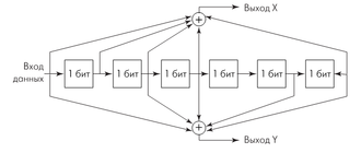 После кодера Рида-Соломона данные поступают в сверточный кодер (рис. 3.11) с порождающими последовательностями (генераторами кода)