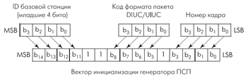 . Начиная со второго пакета кадра генератор ПСП инициализируется на основе идентификационного номера базовой станции BSID, идентификатора профиля пакета DIUC33 и номера кадра (см. рис. 3.10). В восходящем потоке все происходит аналогично, с той лишь разницей, что инициализация генератора ПСП по схеме, приведенной на