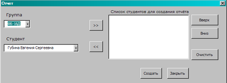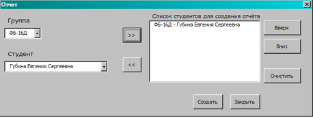 Кнопки «>> » и «<<» добавляют и удаляют студентов из списка для создания отчёта: