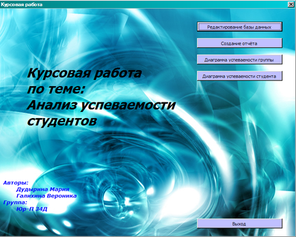 При нажатии кнопки «Выход» в окне «Курсовая работа» осуществляется выход из программы.
