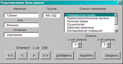 С помощью этого окна можно изменять список студентов, их успеваемость по конкретному предмету, добавлять новые записи, удалять, а также просматривать уже имеющуюся информацию.