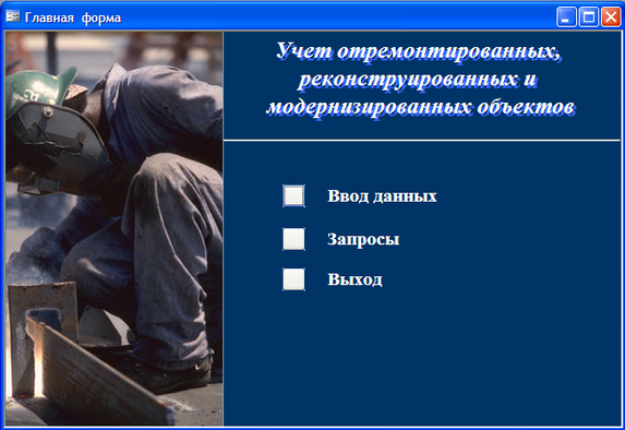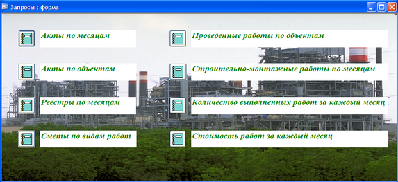 Все формы БД были созданы с помощью Мастера. Главной является Кнопочная форма, которая создана с помощью Диспетчера кнопочных форм (меню Сервис Служебные программы Диспетчер кнопочных форм). На ней находятся кнопки для открытия основных форм и форм запросов.