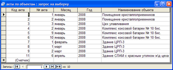 Рисунок 3.10 - Результат запроса «Акты по объектам»