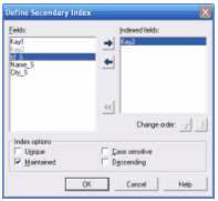 Теперь в этом же окне можно вносить изменения, а именно добавлять индекс. В выпадающем списке Table properties выбрать Secondary Indexes (дополнительные индексы) и нажать кнопку Define (определить). Выбрать свой второй ключ и переместить его в список Indexed fields (индексированные поля). Для этого надо нажать кнопку с изображённой стрелкой вправо (рисунок 5). Можно нажимать OK. Сразу запросится имя индекса, введено Network12 и снова нажать OK. После этого сохранить таблицу.