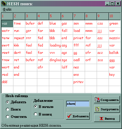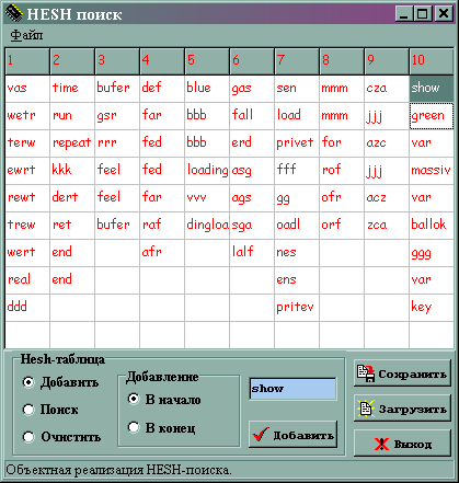 Procedure SaveHesh(FileName:String) - сохранение контейнера в текстовом файле с именем файла
