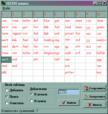 function Search(aKey:string;var aCount:integer):string – Функция поиска заданного элемента Hesh-таблицы. aCount – количество сравнений. Возвращает: ‘0’ – элемент найден, иначе сам ключ.