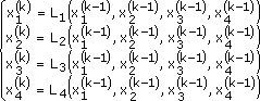 Способ итераций дает возможность получить последовательность приближенных значений, сходящихся к точному решению системы. Для этого система приводится к виду (для случая системы из четырех уравнений):