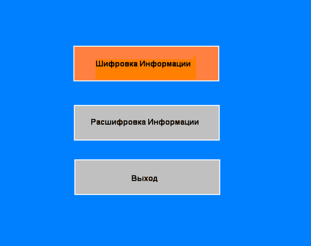 Клавішами “догори” і “донизу” необхідно вибрати дію, яку буде виконувати програма: “Шифровка Информации”, “Расшифровка Информации” або “Выход”.