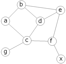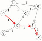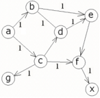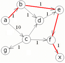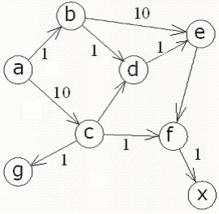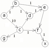 db(X,Y):-db_path(X,Y,P,C), path(X,Y,MP,MC), MC retract(db_path(X,Y,P,C)), assert(db_path(X,Y,MP,MC)), db(X,Y). Отношение db0 инициализирует первый возможный путь. Если данный путь не единичен, то db инициализирует следующий путь, и в то же время сравнивает длины двух данных путей. В процессе последующих рекурсий и сравнения остается только один путь, длина которого минимальна. Текст программы: domains i=integer s=symbol list=s* database db_path(s,s,list,i) predicates path(s,s,list,i) path1(s,list,i,list,i) member(s,list) arca(s,s,i) db0(s,s) db(s,s) run(s,s) start goal start. clauses start:-makewindow(1,7,7,"Expert System",1,3,22,71),clearwindow, write("Enter the name of cities"),nl, write("The first city: "), readln(First),nl, write("The second city: "), readln(Second),nl, run(First,Second),readchar(_). arca (a,b,1). arca(a,c,1). arca(b,e,1). arca(b,d,1). arca(c,d,1). arca(c,g,1). arca(c,f,1). arca(d,e,1). arca(e,f,1). arca(f,x,1). run(Start,End):-db0(Start,End), db(Start,End), db_path(Start,End,MP,MD), write("Optimum way: "),write(MP),nl, write("Length of an optimum way="),write(MD), nl,nl. path(A,Z,Path,C):- path1(A,[Z],0,Path,C). path1(A,[A|Path1],C,[A|Path1],C). path1(A,[Y|Path1],C1,Path,C):- arca(X,Y,CXY), not(member(X,Path1)),C2=C1+CXY, path1(A,[X,Y|Path1],C2,Path,C). member(Head,[Head|_]). member(Head,[_|Tail]):- member(Head,Tail). db0(X,Y) :-path(X,Y,P,C), assert(db_path(X,Y,P,C)). db(X,Y):-db_path(X,Y,P,C), path(X,Y,MP,MC), MC retract(db_path(X,Y,P,C)), assert(db_path(X,Y,MP,MC)), db(X,Y). db(_,_). а) Пусть имеем следующий граф: Ищем оптимальный путь из a в х, согласно графу оптимальный путь содержит следующие узлы: a c f x, что изображено на рис.2а. Программа: Данные ручного расчета и программы совпадают. б) Изменим длину ребра a-c: Ищем оптимальный путь из a в х, согласно графу оптимальный путь содержит следующие узлы: a b e f x, что изображено на рис.3а. Программа: Данные ручного расчета и программы совпадают. в) Изменим длину ребра b-d: Ищем оптимальный путь из a в х, согласно графу оптимальный путь содержит следующие узлы: a b d e f x, что изображено на рис.4а. Программа: Данные ручного расчета и программы совпадают. И 57. Использование Турбо-Пролога: Пер. с англ.-М.:Мир, 1990.-410 с., ил. Б 87. Братко. Программирование на языке Пролог для искусственного интеллекта: Пер. с англ. -М.: Мир, 1990.- 560 с., ил