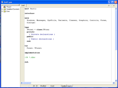 В окне редактора кода (рис. 10), которое можно увидеть, отодвинув в сторону окно формы, следует набирать текст программы. В начале работы над новым проектом это окно редактора кода содержит сформированный Delphi шаблон программы.