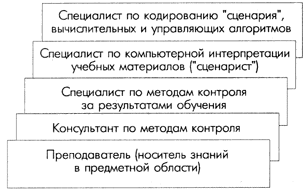 Разработка компьютерного пособия как программного обеспечения (ПО) учебного назначения является многопрофильной задачей, реализация которой возможна только на основе привлечения специалистов разных областей. На рисунке представлен функциональный состав группы разработчиков, в которую помимо преподавателя-предметника должны входить специалисты по компьютерным методикам обучения и компьютерной интерпретации учебных материалов, методам контроля, а также программисты.