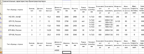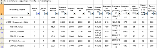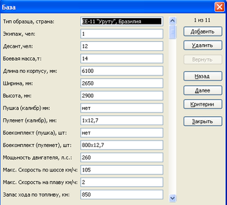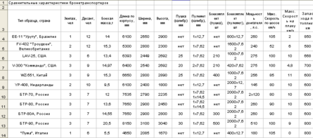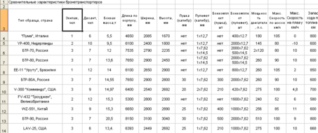 База создана на основе данных, взятых из источника[2] и содержит информацию об основных технических характеристиках БТР и состоит из 15 полей и 11 записей. Применяются одного типа: числовые (экипаж, десант, масса, длина и другие). База данных приведена на рисунке 1.