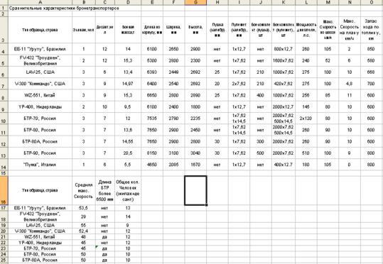 Для выполнения фильтрации данных по длине БТР больше, чем 6500 мм с использованием расширенного фильтра необходимо сначала создать дополнительную головку таблицы идентичную базе данных и в столбце «Кол-во цилиндров» задать число цилиндров. Затем открыть в меню «Данные» подменю «Фильтр» и выбрать команду «Расширенный фильтр». В открывшемся диалоговом окне указать исходный диапазон и диапазон условий. Результат расширенного фильтра приведен на рисунке 4.