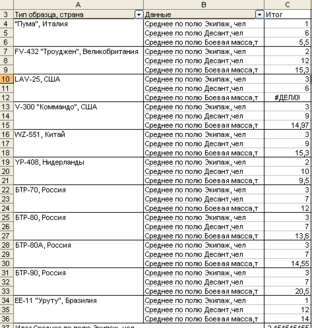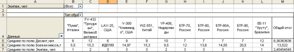 В сводной таблице 1 используются следующие поля: «Боевая масса»,»Экипаж», «Десант». Над данными полями произведена Операция «Среднее». Сводная таблица 1 приведена на рисунке 8.